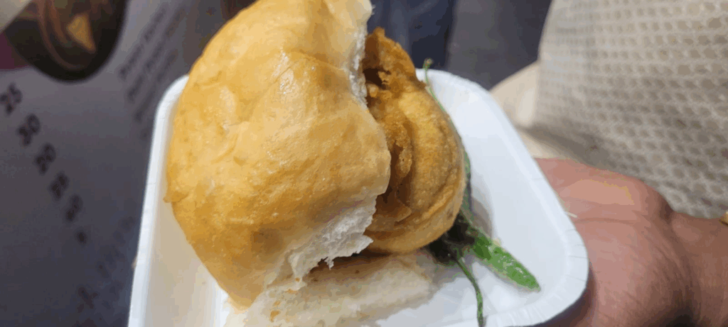 ஒரு பிரபல தெருமுனைக்கடையில் வடா பாவ் ஆர்டர் கொடுத்தான். பிளந்த பன்னில் உருளைக்கிழங்கு போண்டாவைத் திணித்து, கூடவே எண்ணெயில் பொரித்து உப்பில் பிரட்டிய பச்சை மிளகாய்களையும் தட்டில் வைத்துத் தருகிறார்கள். நான் உருளைக்கிழங்கைச் சாப்பிடுவதில்லை, எனவே போண்டாவை டிசெக்ட் பண்ணி கிழங்குத் திணிப்பை அகற்றி மிளகாயுடன் பன்னைச் சாப்பிட்டேன். ” இப்படிச் சாப்பிட்டா எப்படி உனக்கு பிடிக்கும்?” என்றான். “வடா பாவை எப்படிச் சாப்பிட்டாலும் எனக்குப் பிடிக்காதுடா” என்றேன்.